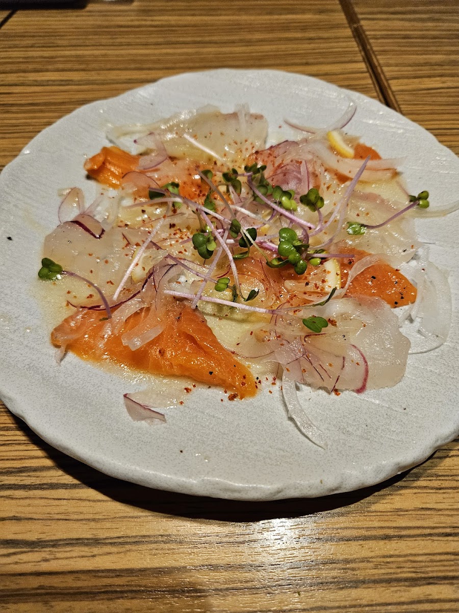 The atmosphere leans casual and welcoming, but the menu shows real attention to detail. One of the standout dishes is the チーズフォンデュ, which blends rich, creamy cheese with a Japanese twist that feels indulgent without being heavy. It’s the kind of dish that encourages sharing and sets the tone for a social, laid-back meal. Right alongside it, the 真鯛とサーモンのカルパッチョ delivers freshness and balance, combining delicate sea bream and salmon with clean flavors that highlight the quality of the ingredients.